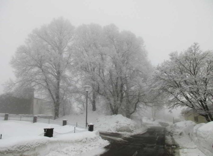 Mit Schneepflügen wird der Schnee in den Garten der Kapelle geschoben, aufgetürmt und die Kapelle versinkt dann förmlich im Schnee. Wenn man vor lauter Schnee nicht weiß wohin, dann kann man das nachvollziehen. Vergessen darf man dabei aber nicht, dass das für die Bäume nicht gut ist, auch nicht für die Kapelle.