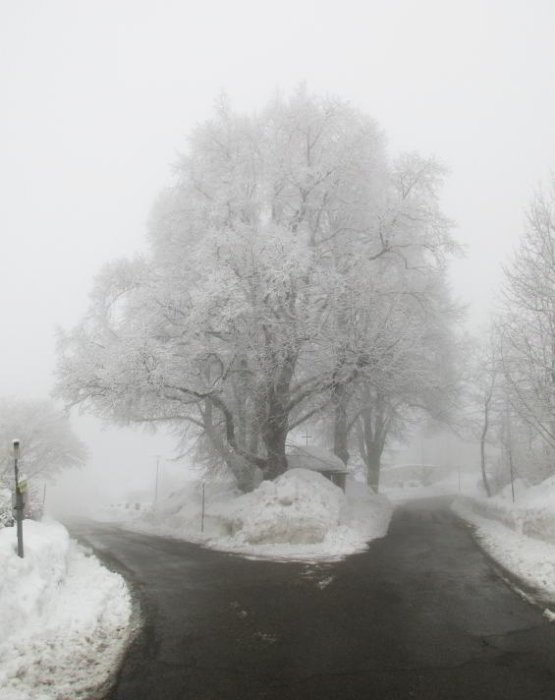 Mit Schneepflügen wird der Schnee in den Garten der Kapelle geschoben, aufgetürmt und die Kapelle versinkt dann förmlich im Schnee. Wenn man vor lauter Schnee nicht weiß wohin, dann kann man das nachvollziehen. Vergessen darf man dabei aber nicht, dass das für die Bäume nicht gut ist, auch nicht für die Kapelle.